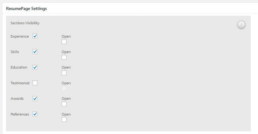 On Resume page in wp-admin the client can to choose whether to display new sections on the site page: