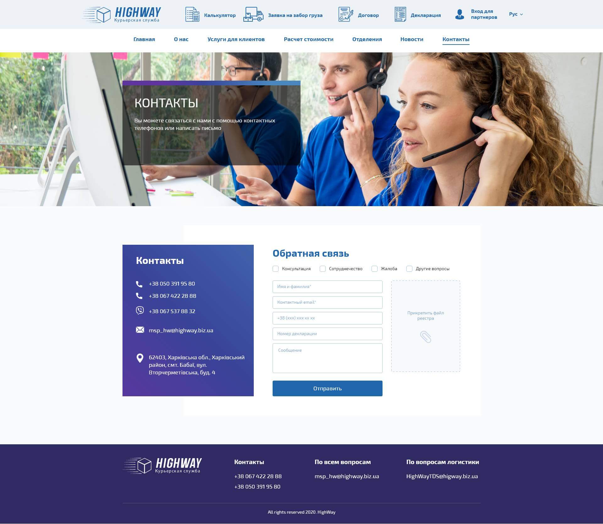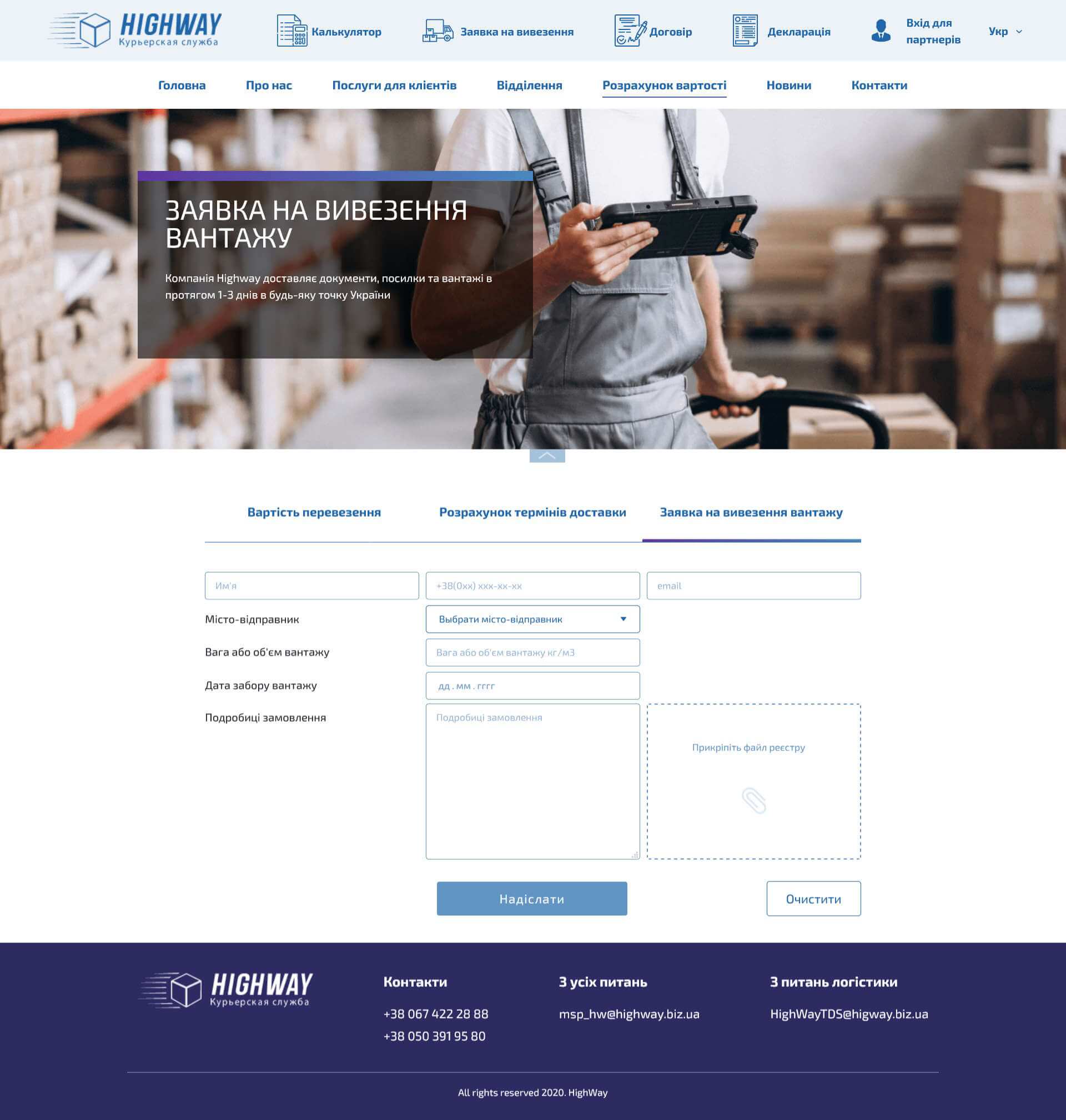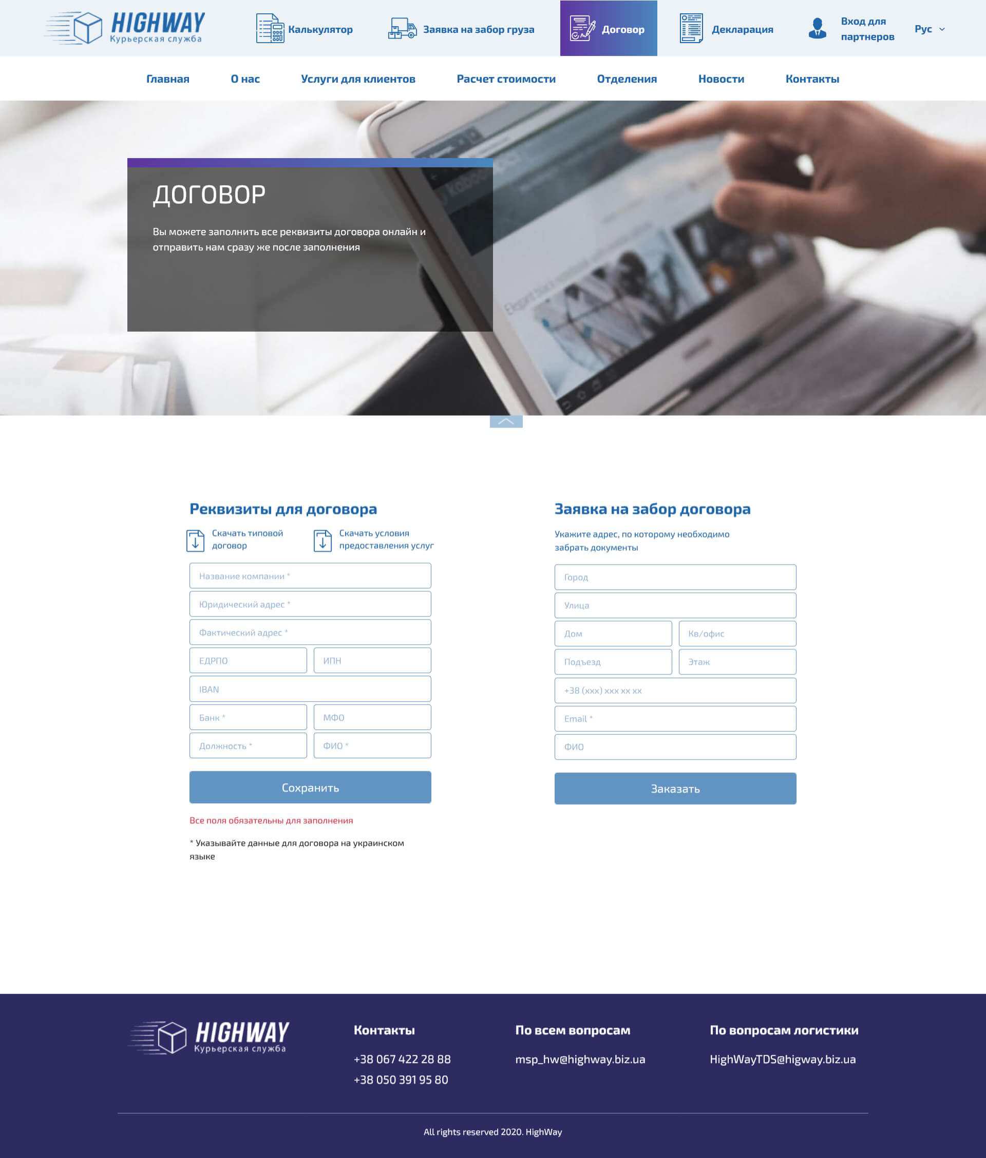 - Many forms: contact form of the site, application for cargo pick-up, application for a contract