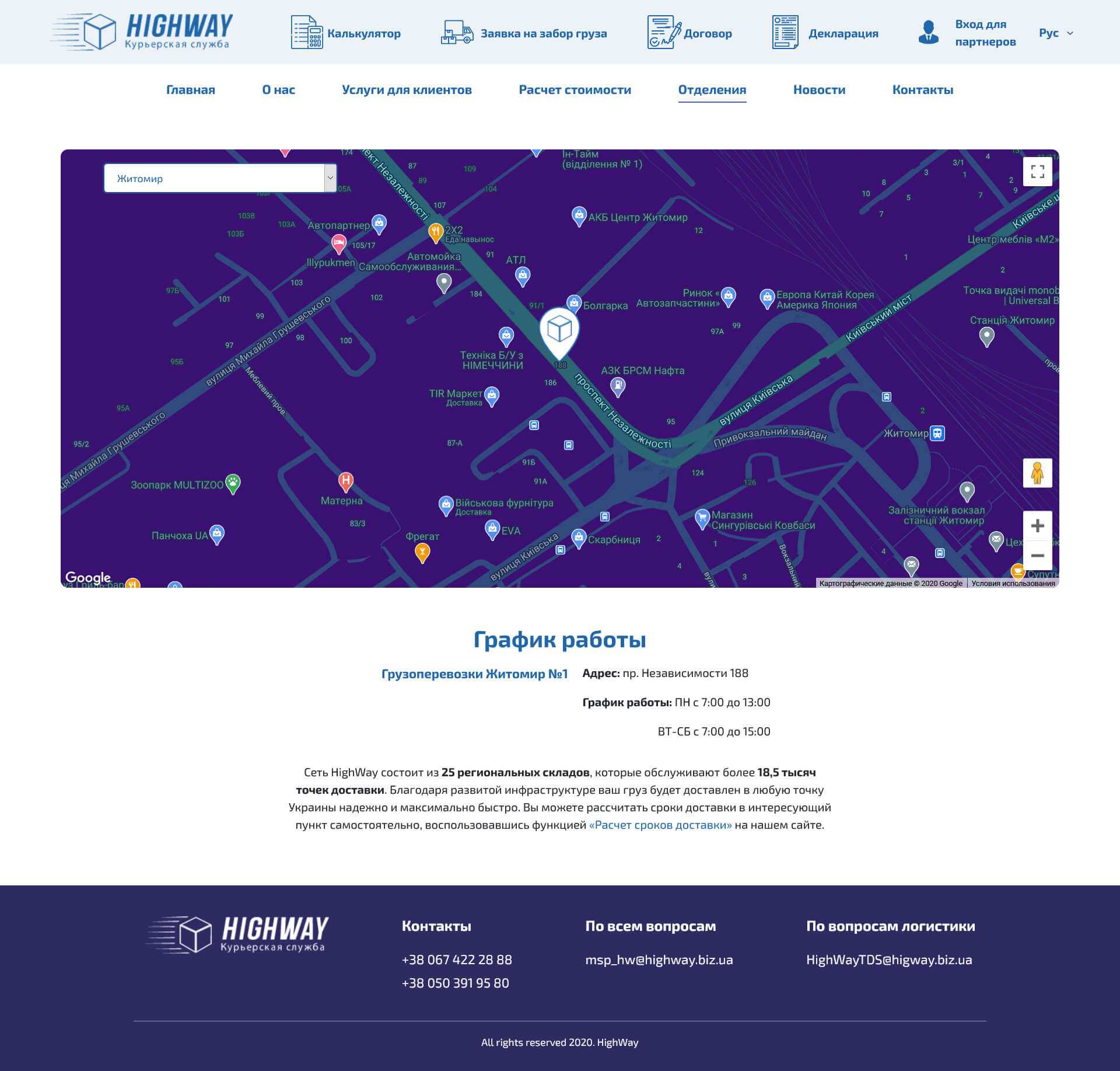 The Logistics page contains a Google map of Highway branches. User can select a city and find the address and working hours Highway in this city.