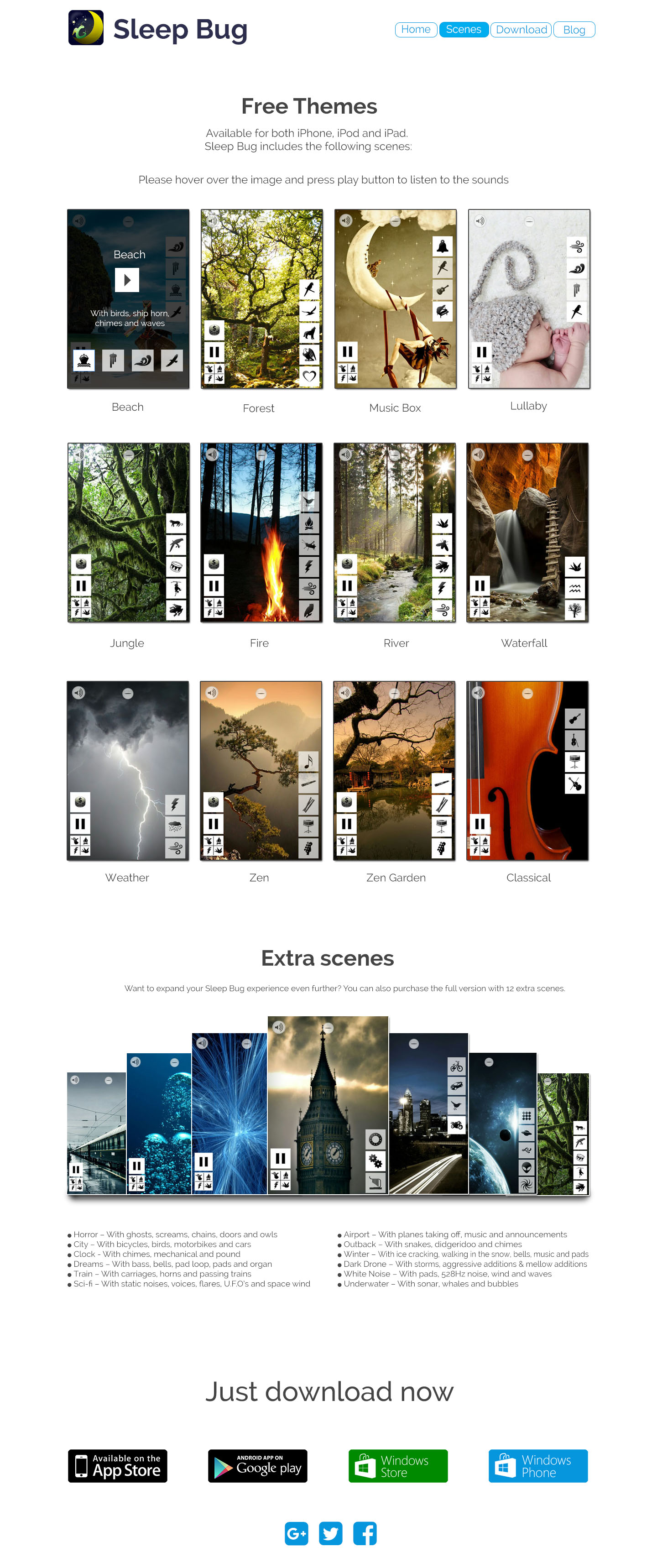 Design for Landing Page site of SleepBug Application — Scenes Page.